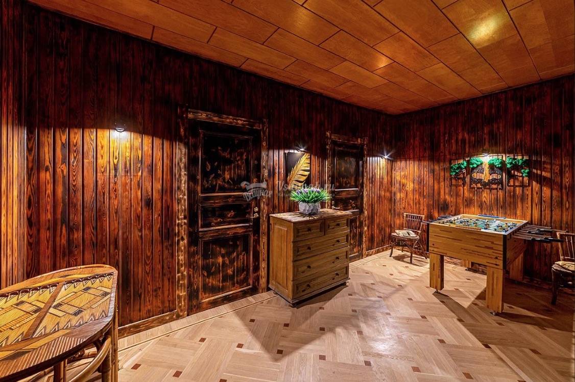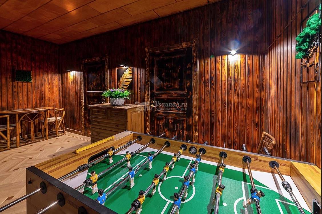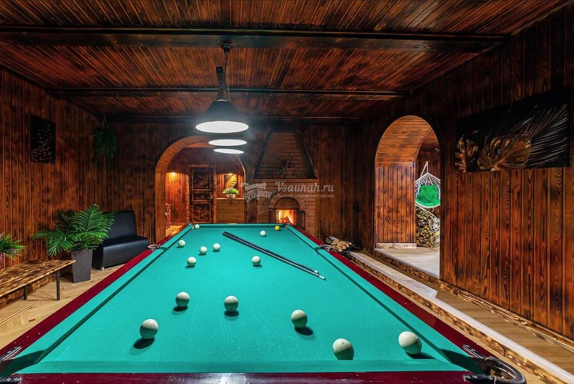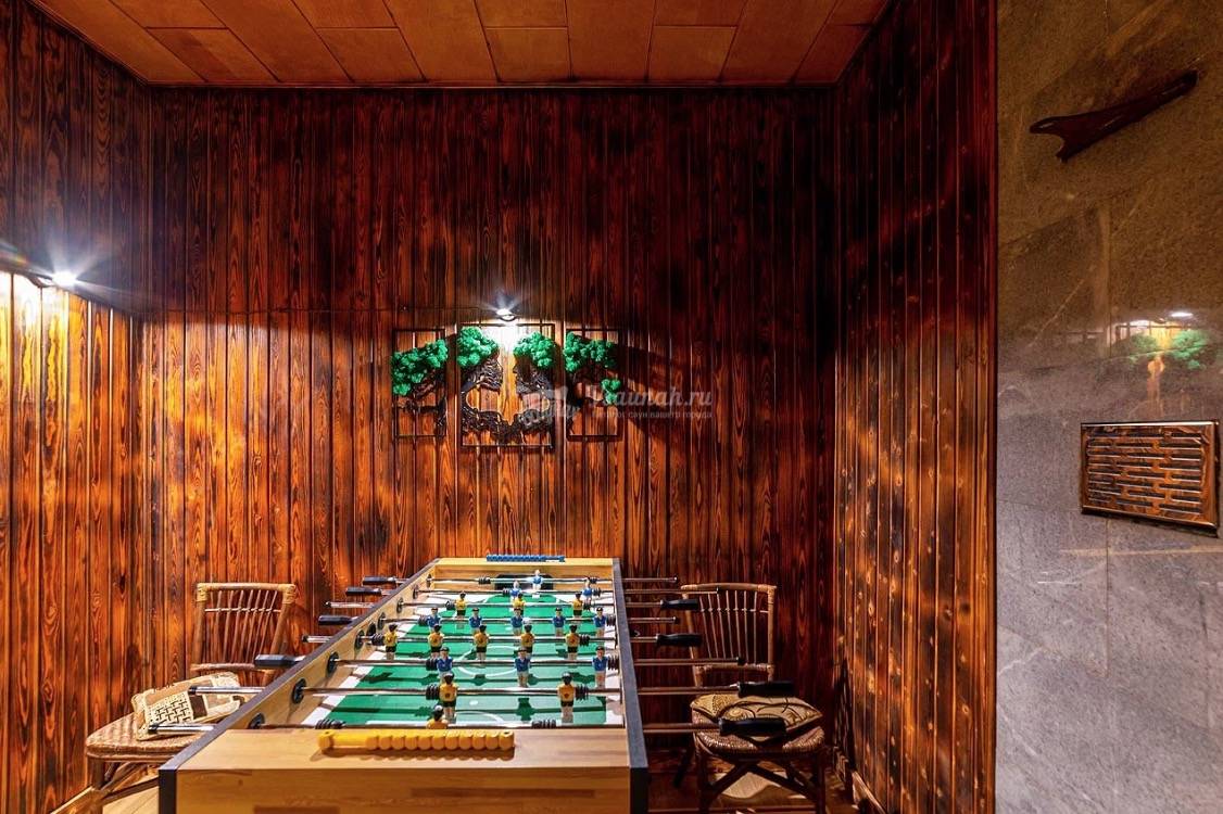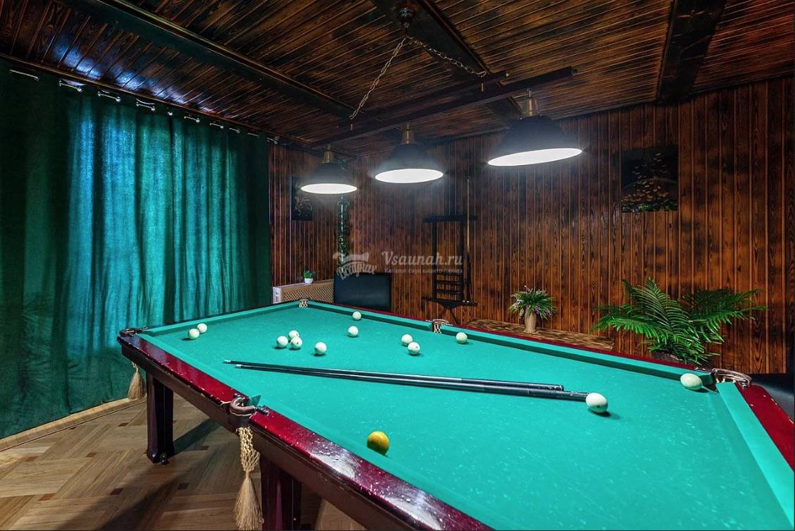 Баня на дровах, русский бильярд, настольный футбол, банкетный зал, 2 комнаты отдыха, бассейн, купель, караоке.